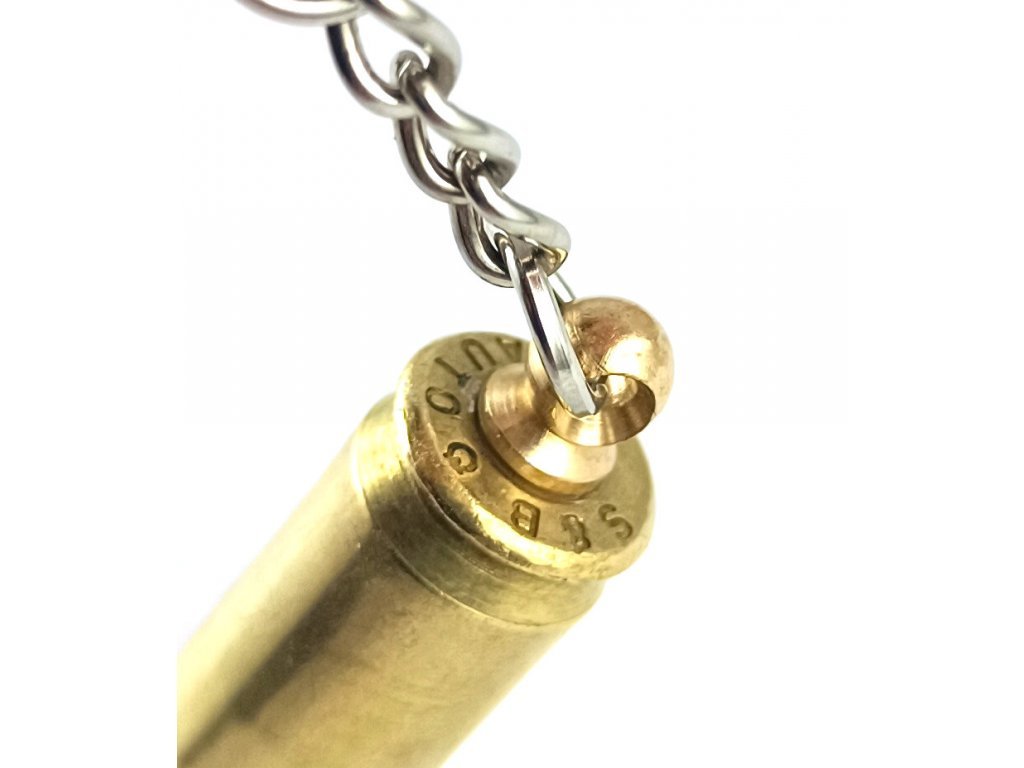 The keychain loop is machined from brass and securely crimped into the base of the cartridge at the primer position, ensuring the pendant's waterproof nature, setting it apart from similar competing products. Brass components can be polished with brass restoration products like Brasso.